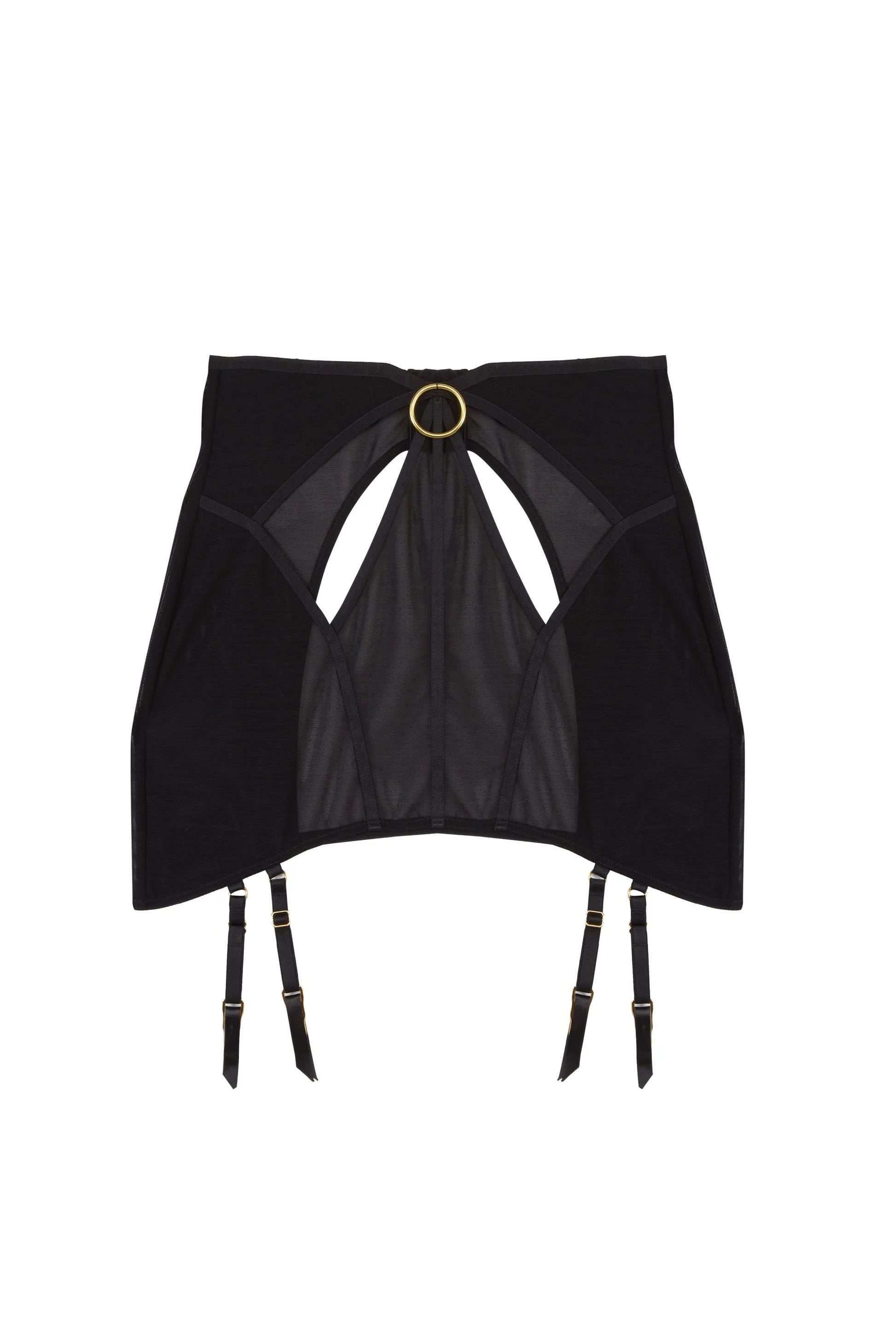 Give your lingerie collection the ring of confidence with the 'Emilia Black Mesh Cut Out Double Ring Girdle' - bold, sexy and designed to make a statement. This black high waist girdle with bondage appeal is constructed from panels of supportive sheer black mesh, which frame the hips and bottom, giving a very cheeky peek at what is underneath! Satin elastic trim detailing leads to a central gold metal ring, whilst four adjustable suspender straps and a hook and eye fastening back ensure the perfect fit.