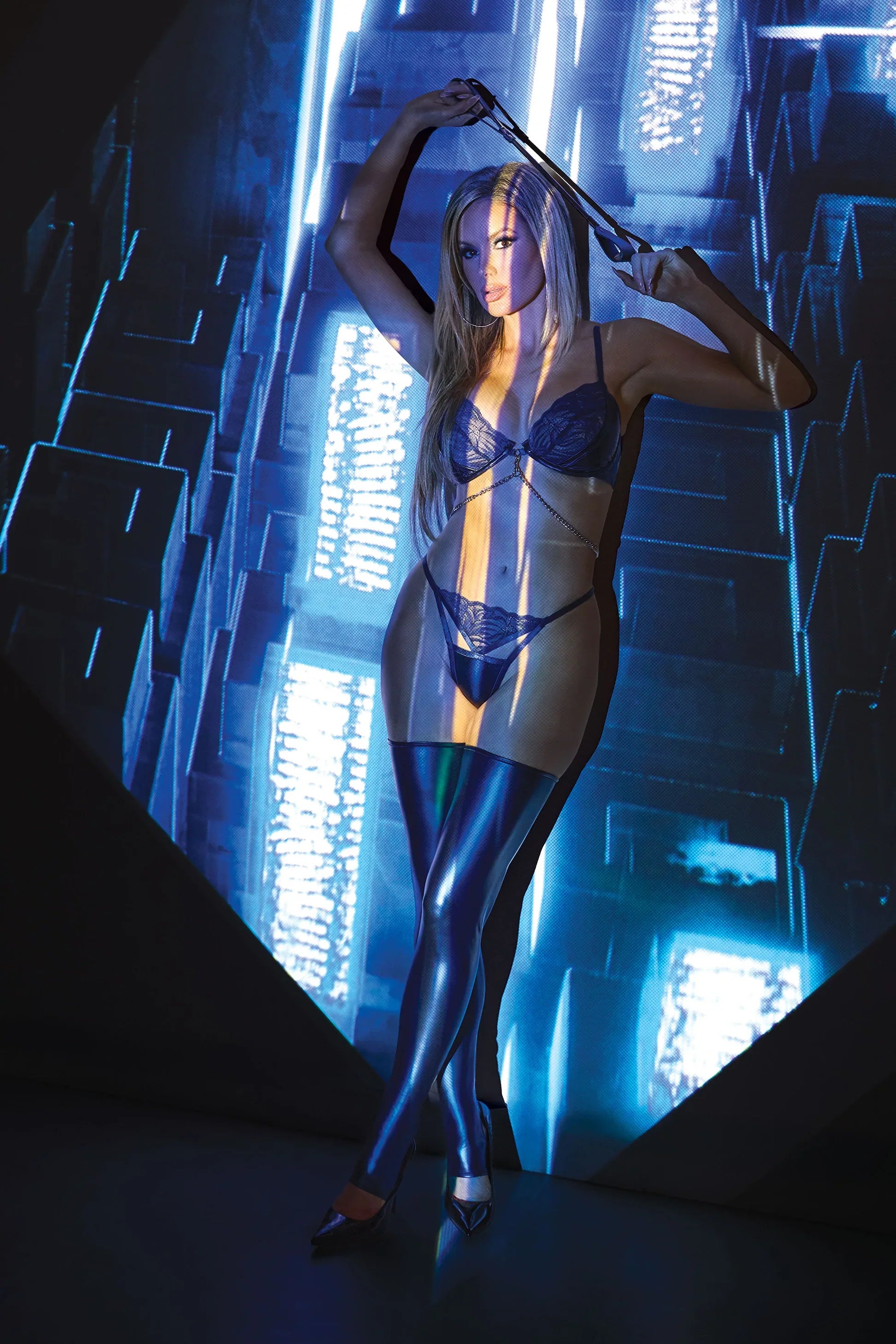 Dark, daring, and designed to impress—the Midnight Bra & Thong Set combines seductive lace with bold wet-look accents for a look that’s equal parts sultry and edgy. The bra features soft lace cups with underwire support, framed by glossy underbust detailing and silver-tone ring accents. The matching thong amps up the heat with a flirty cutout design, adjustable straps, and removable chain detailing for customizable drama. Finished with sleek silver-tone hardware, this set is made to steal the spotlight.