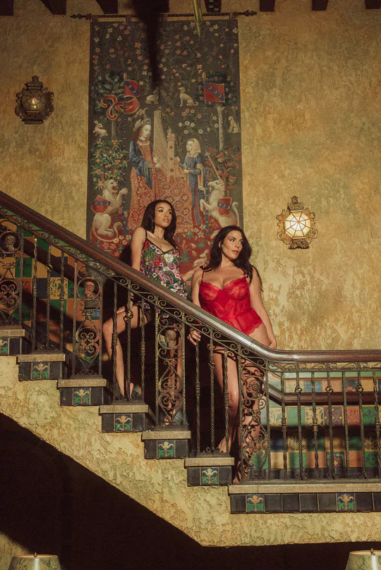 This bestseller delivers the complete package. Engineered with underwire cups, strategic boning, and adjustable straps for a sculpted silhouette, it's finished with a hook-and-eye back closure for easy adjustments. The thong back and convenient snap crotch keep things practical without sacrificing style. Wrapped in stunning custom scarlett red embroidery and trimmed in luxe matte satin, it's the statement piece that works as hard as you do—whether solo or layered under your favorite sheer moments.