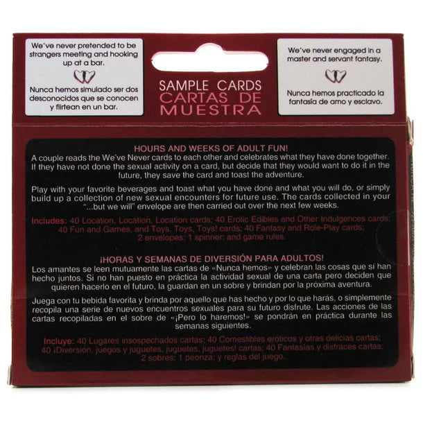 Hours and Weeks of Adult Fun! A couple reads the We've Never cards to each other and celebrates what they have done together. If they have not done the sexual activity on a card, but decide that they would want to do it in the future, they save the card and toast the adventure. Play with your favorite beverages and toast what you have done and what you will do, or simply build up a collection of new sexual encounters for future use.